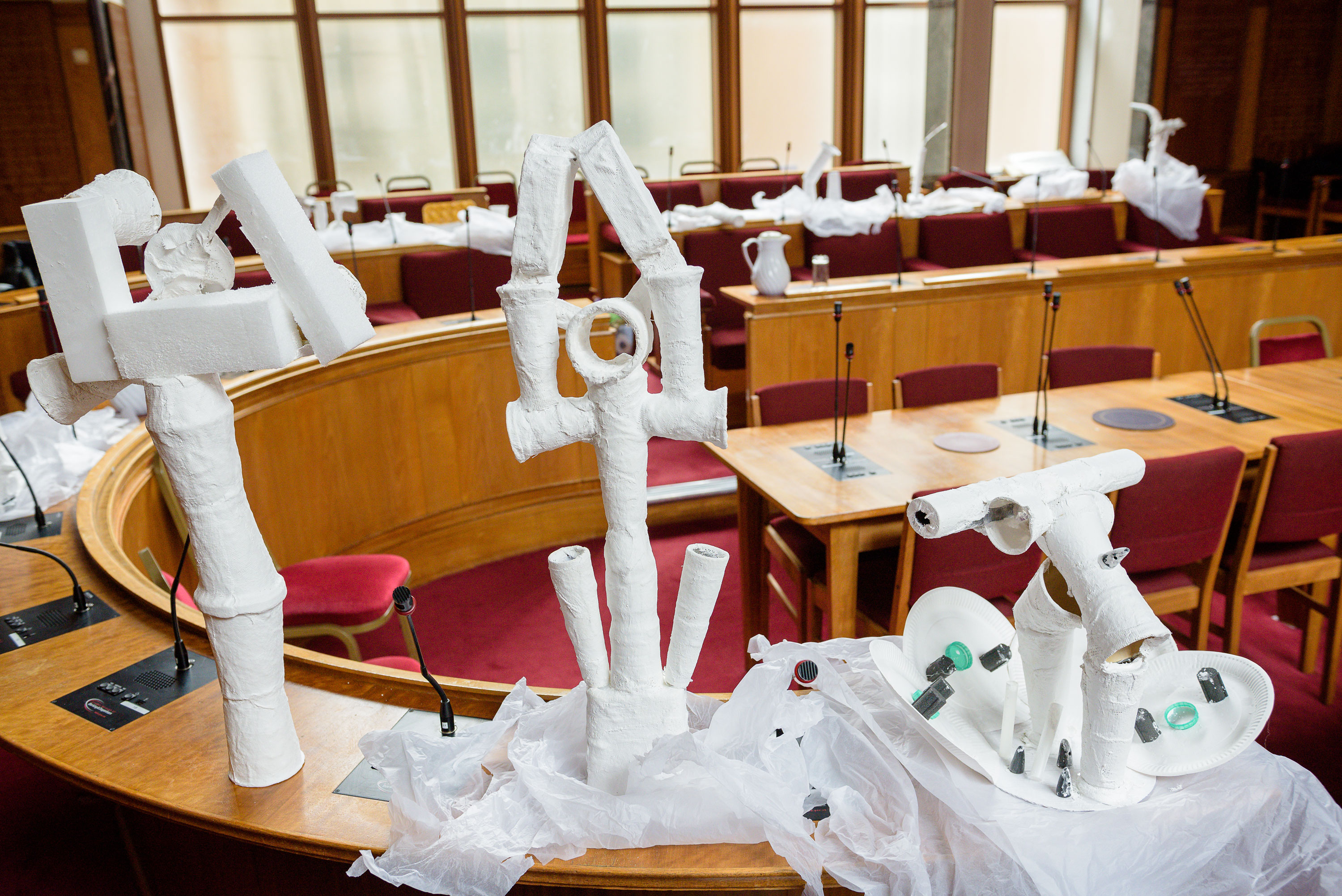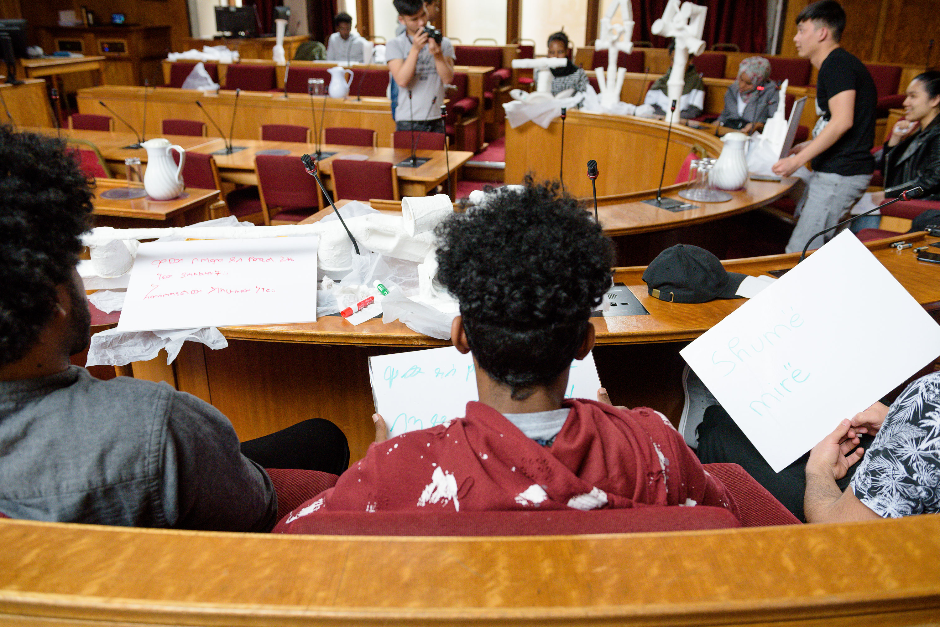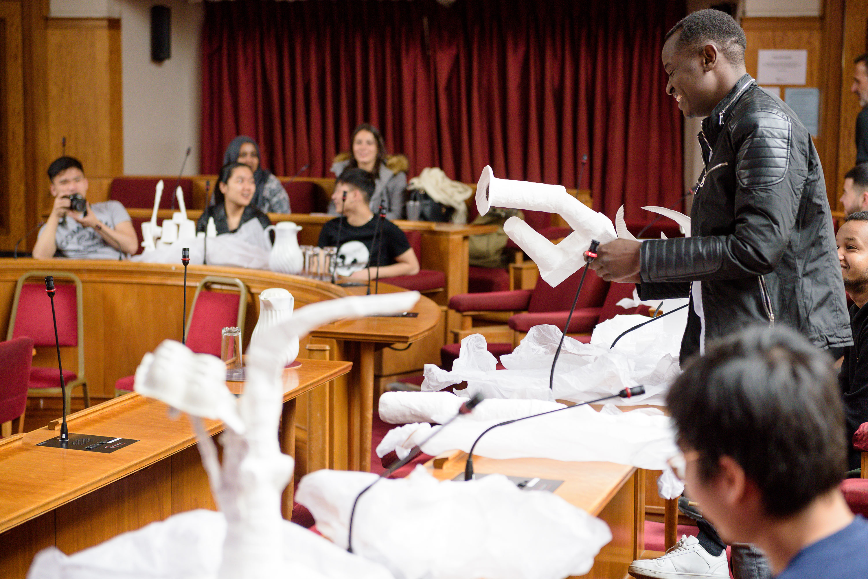 The work took place in a council social care space which all the young people had previous experience of visiting. Together the group worked outside in the locality filming, performing, and experimenting with communication devices. They travelled into central London to visit Tate Modern where they saw work by the artist Franz West. The project ended in the Town Hall Council Chamber where the group performed and shared their work together.