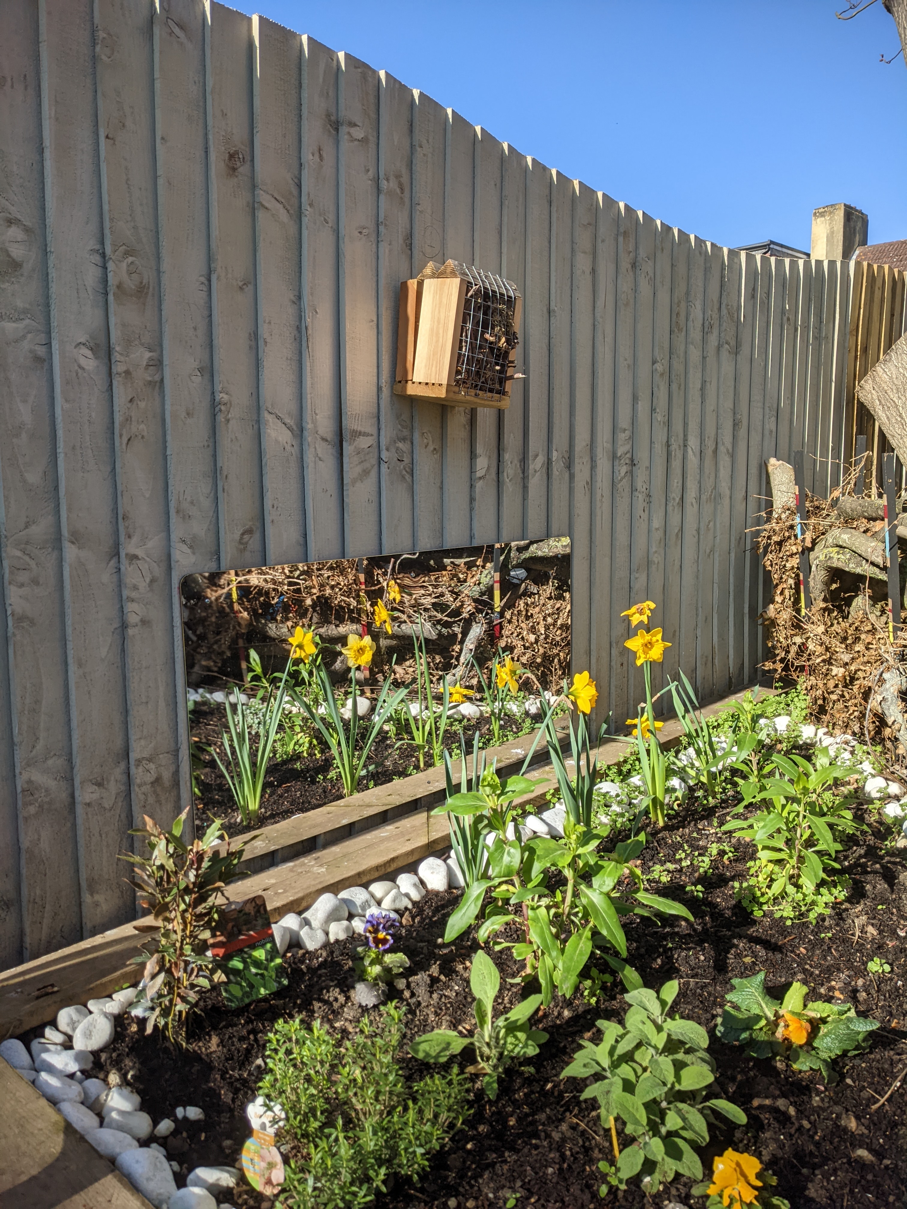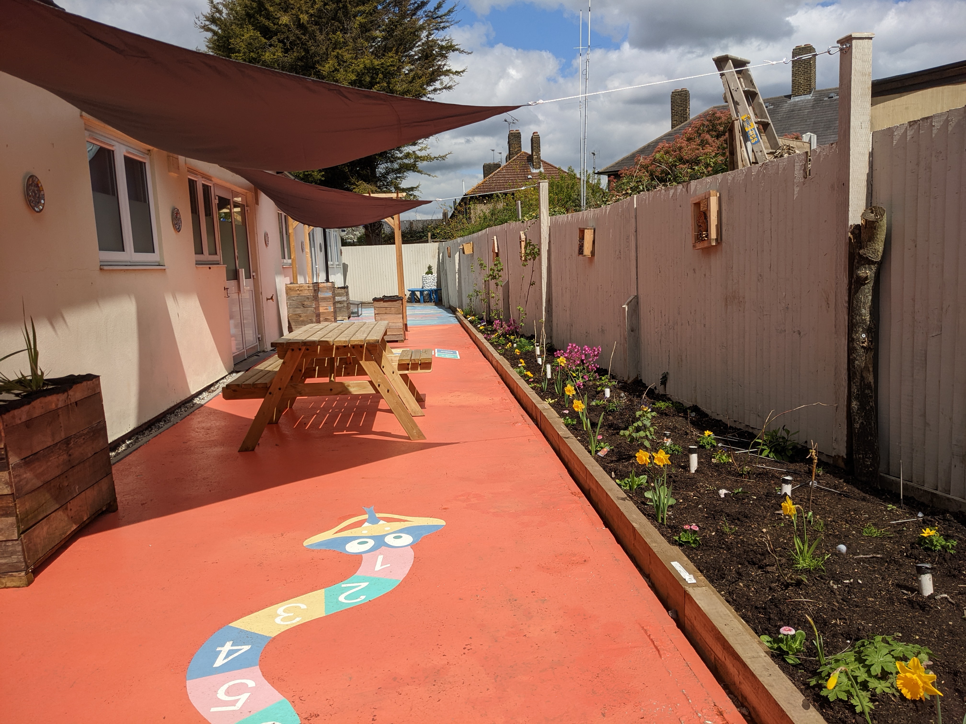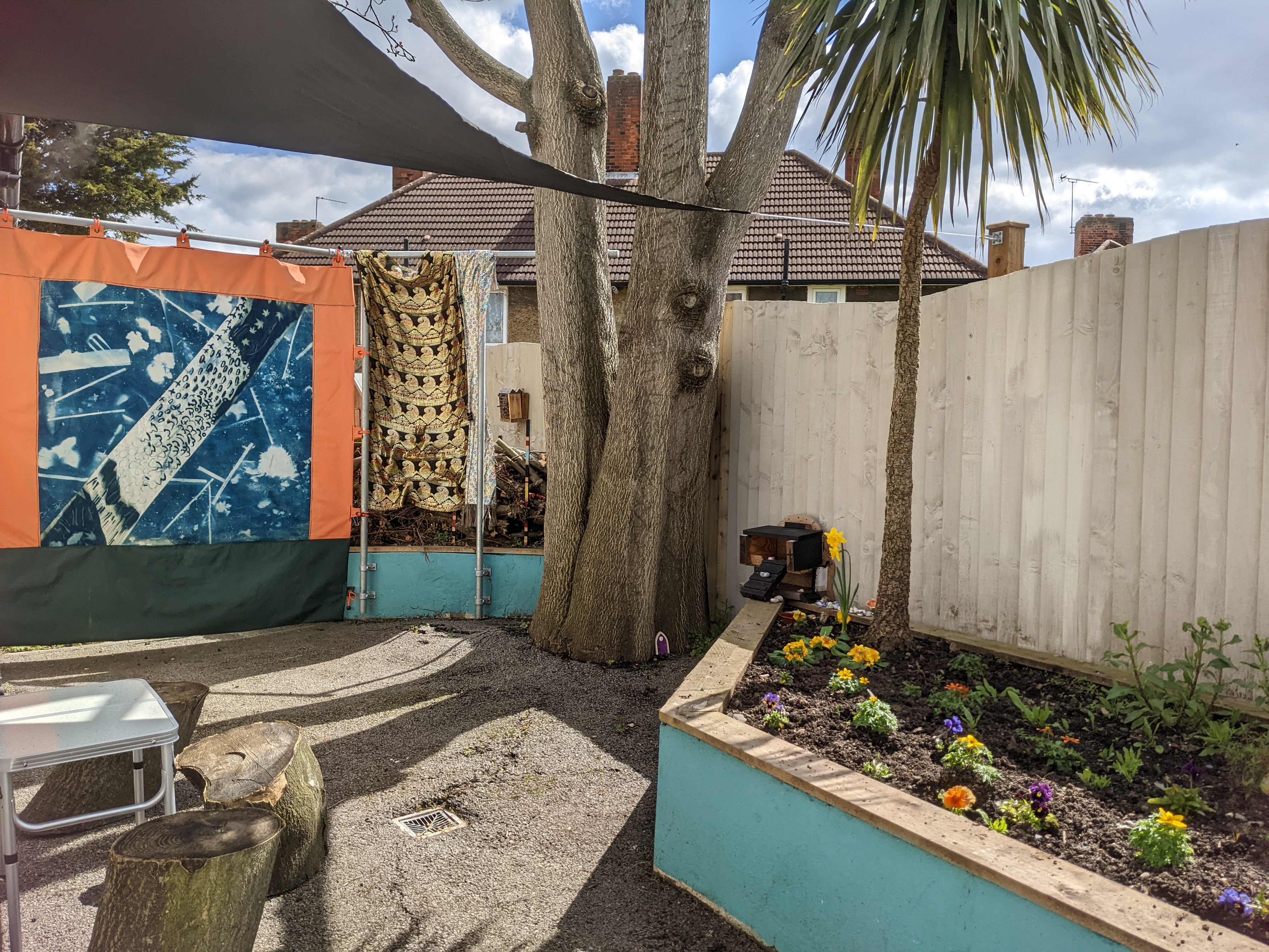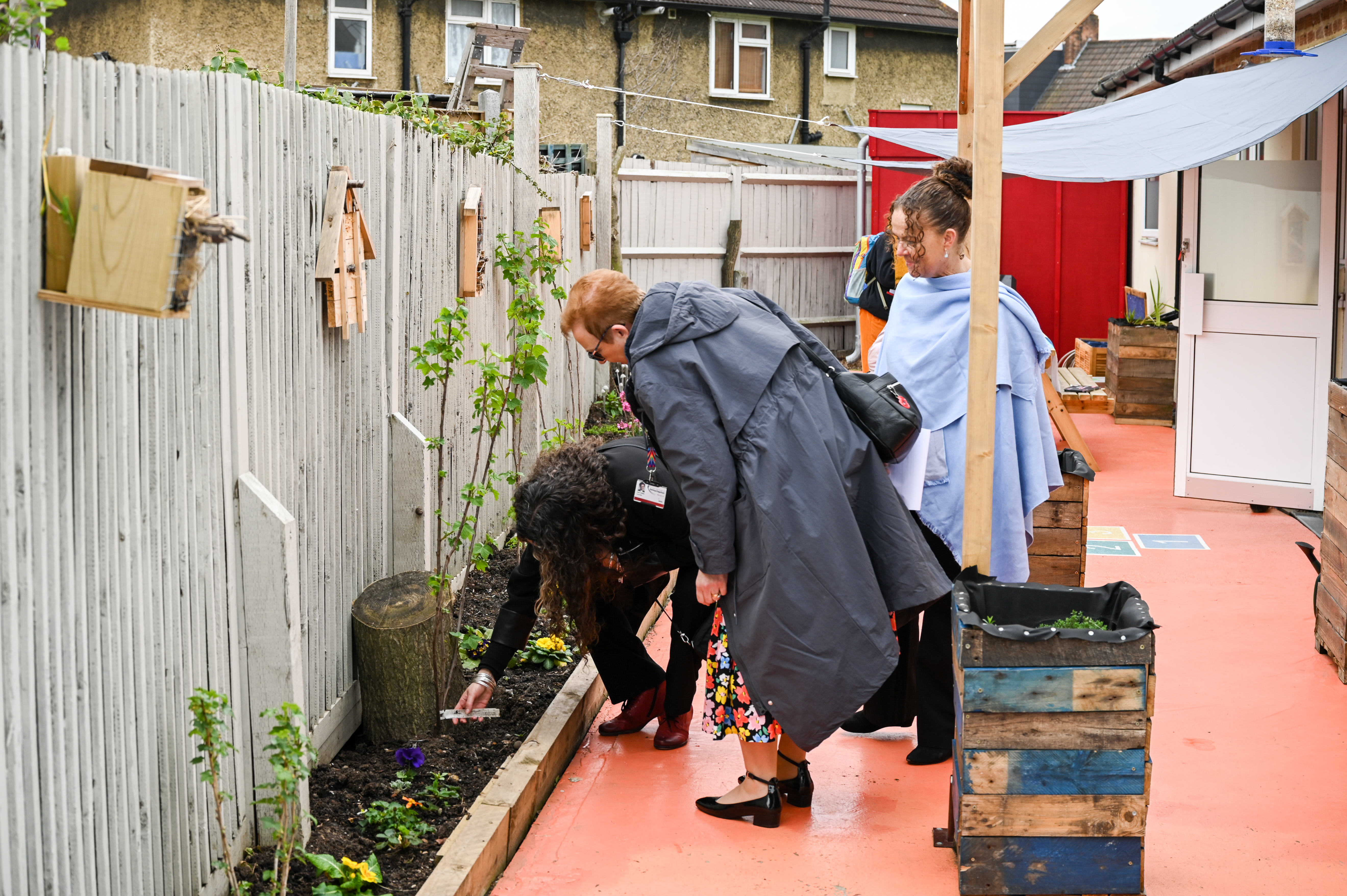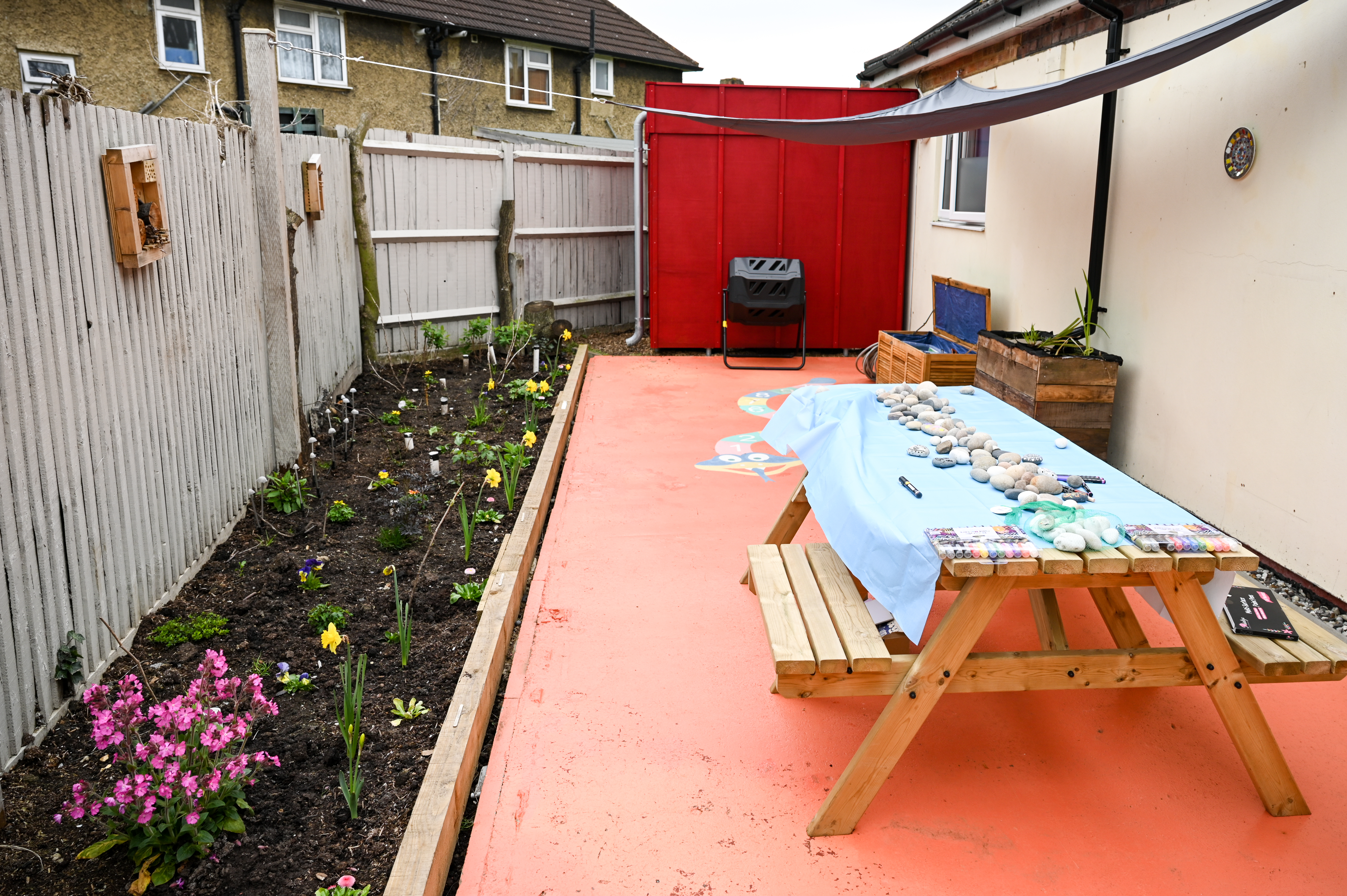 For over a year Carole Wright from Blak Outside based herself in the building, working and collaborating with staff, young people and families using the centre to develop a shared vision for the gardens. The Sanctuary Garden included new growing patches full of fruit trees and berries, raised beds for herbs, picnic benches, garden games, ponds, bird boxes, worm hotels, mosaics, seeds, compost bins, sheds and tools.
